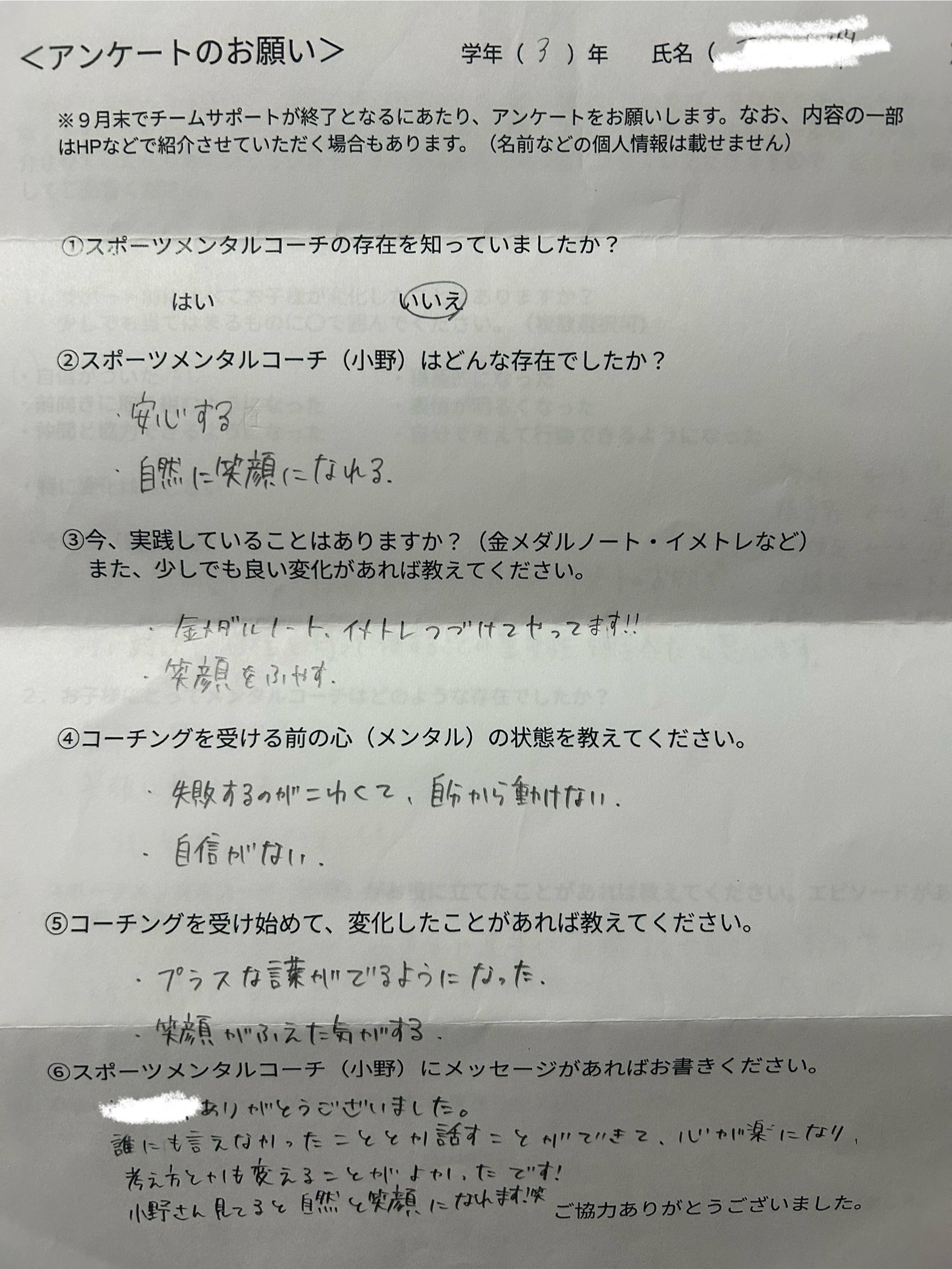 スポーツメンタルコーチ(小野)にメッセージがあればお書きください