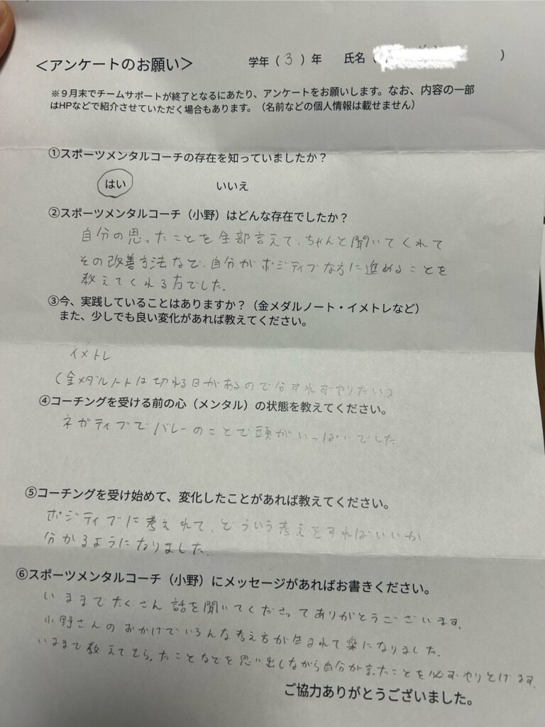 スポーツメンタルコーチ(小野)はどんな存在でしたか?