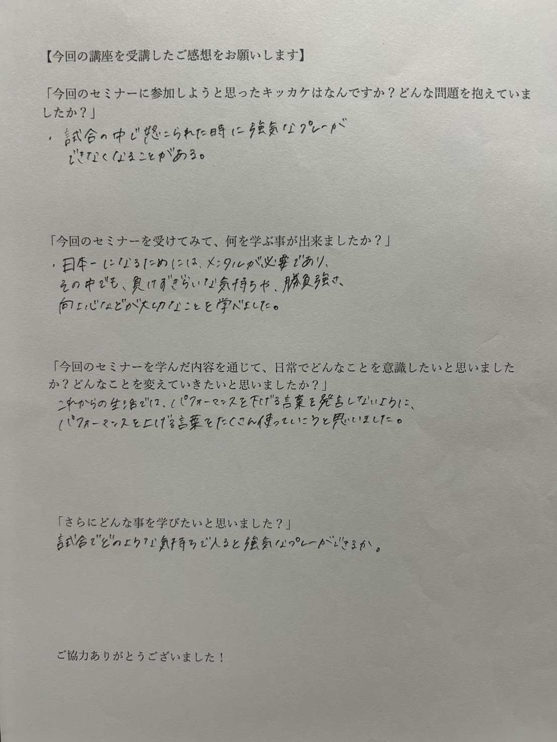 日本一になるためにはメンタルが必要であり、その中でも、負けずぎらいな気持ちや、勝負強さ、向上心などが大切なことを学べました。
