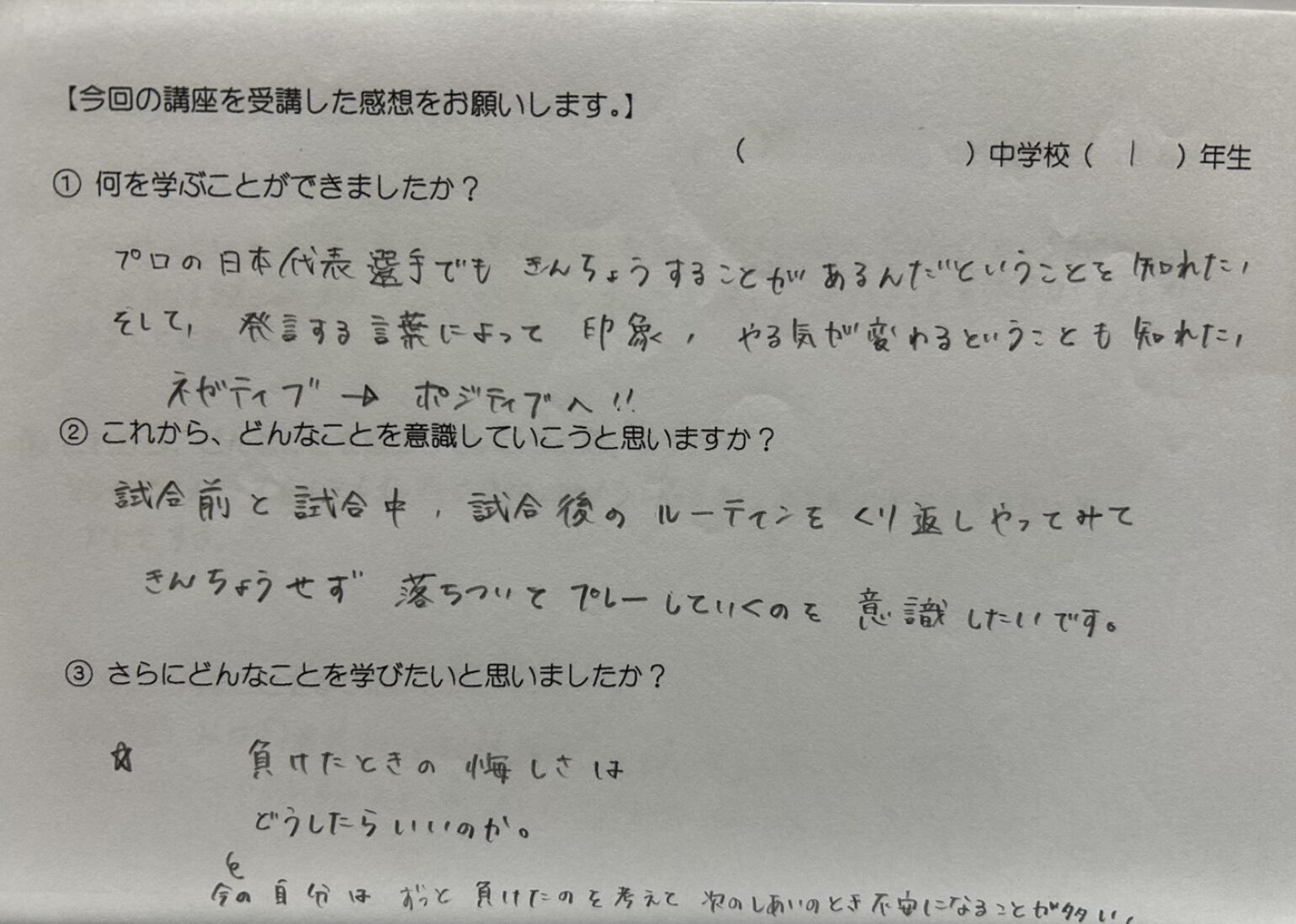 プロの日本代表選手でも緊張することがあるんだということを知れた。そして発言する言葉によって、印象、やる気が変わるということも知れた。