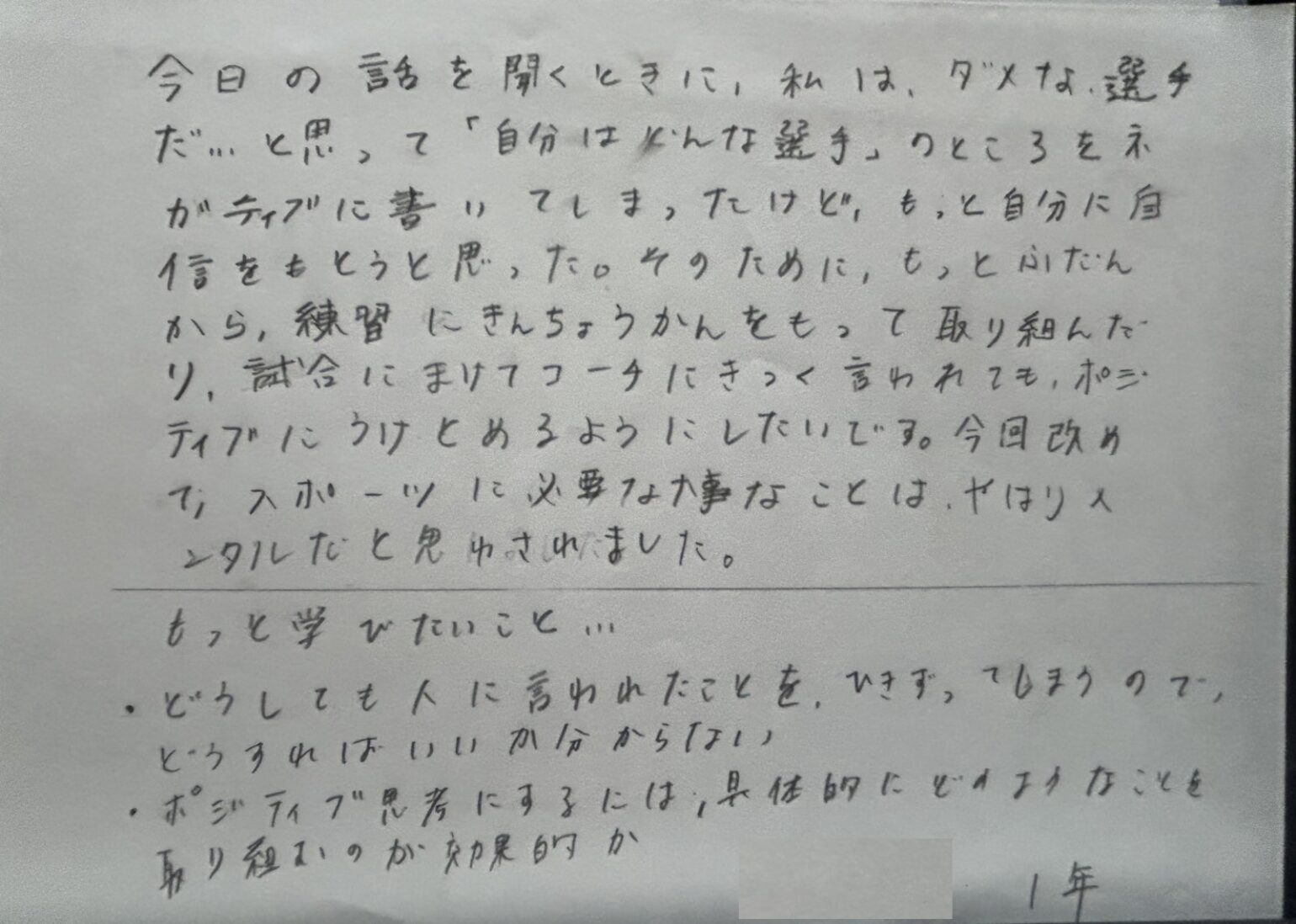 今日の話を聞くときに、私はダメな選手だと思っていて「自分はどんな選手」のところをネガティブに書いてしまったけど、もっと自分に自信を持とうと思った。