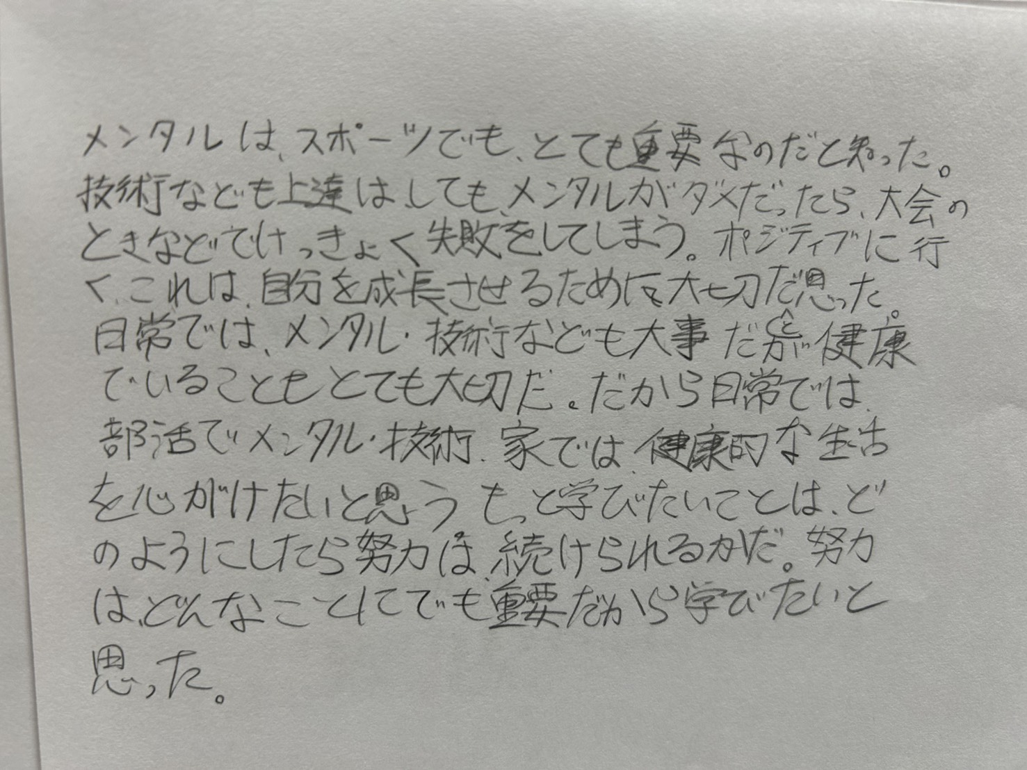 メンタルはスポーツでもとても重要なのだと知った。技術なども上達はしてもメンタルがダメだった大会のときなどでけっきょく失敗をしてしまう。ポジティブにいく。これは自分を成長させるために大切だと思った。