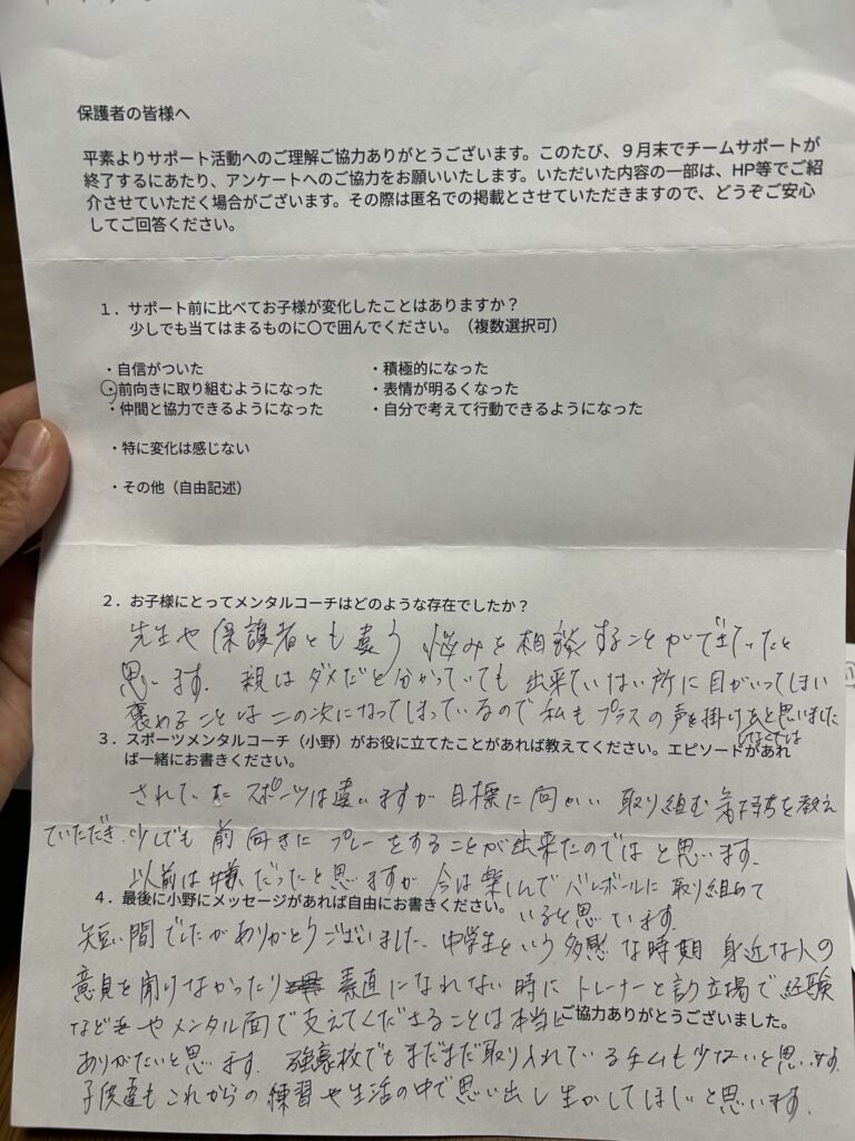 されていたスポーツは違いますが、目標に向かい取り組む気持ちを教えていただき、少しでも前向きにプレーをすることが出来たのではと思います。以前は嫌だったと思います。今は楽しんでバレーボールに取り組めていると思います。
